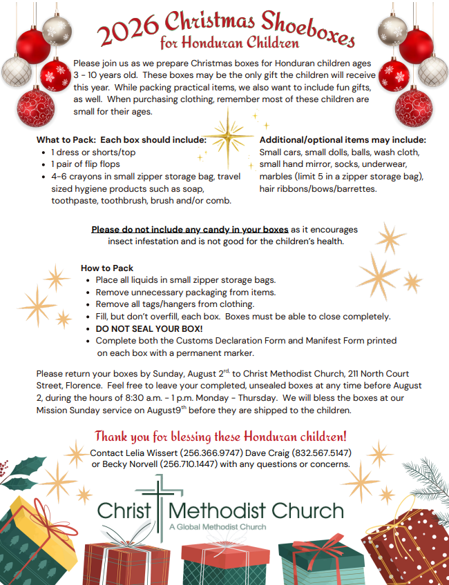 Join us as we share the joy and hope of Christ with children and families in Honduras this Christmas season. Through our Christmas Boxes for Honduras mission, we collect and pack gifts, essential items, and heartfelt messages to be delivered to those in need. This outreach is a meaningful opportunity for our church family to come together in service and extend God’s love beyond our community. We invite you to participate by donating items, packing boxes, or praying for the families who will receive them.